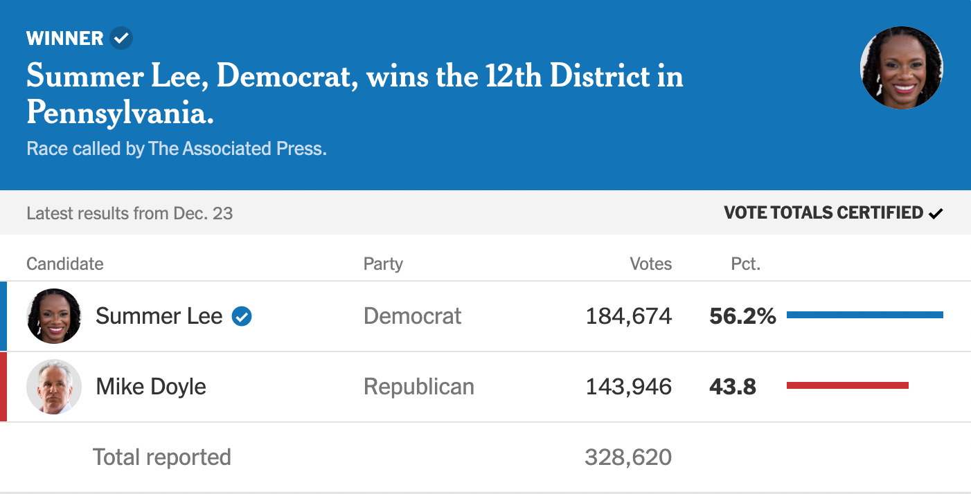 Of all the congressional races that took place in Pennsylvania during the 2022 cycle, PA-12 is the one that merits the most explanation. Candidates like Cartwright and Wild did incredibly well in their districts and were deserving of thorough analyses (as I’ve done in other articles), but it’s pretty straightforward to understand how and why they won. Summer Lee’s story, on the other hand, is a little more complicated. You can see the results of her election below.
